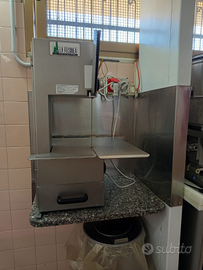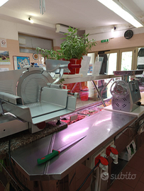 Vendo 1 banco vendita Sifa 7 MT ad angolo vetri curvi apribili in acciaio a specchio, 1 cella frigo 3x2,50 con motore ed evaporatore con guida Irrea e gancera a castello più peso interno, 1affettacarne lama 370, 2 bilance Helmac, 1 ceppo di legno, 2 taglieri di legno,,1 forno a gas per 30 polli, 2 tritacarne, 1 segaossi "La falsinea",1 insaccatrice, 1 registratore di cassa prezzo da concordare tel 3488947951