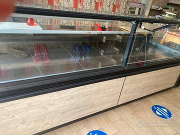 Vendesi banco frigo per salumeria misura da 3 metri, abbinato a murale frigo con due ante scorrevoli, con affettatrice diametro della lama da 38, completa la vendita un macina caffè e formaggio.