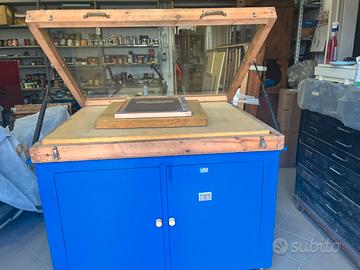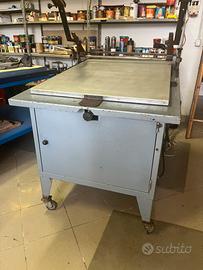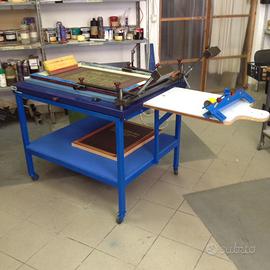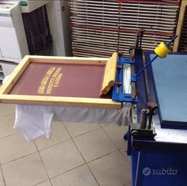 Vendo base di stampa manuale Argon Vega Simplex f.to 50x70 (piano da 64 x88) carrellata e integrata con piano accessorio per stampa magliette, base di stampa Argon Universal 50x70 con aspiratore (piano da 74x88) carrellata, torchio per incisione-bromografo a libro (cristallo 130x100) lampada al quarzo sospesa) artig. con mobile asciuga quadri di stampa ad aria calda, tagliacarte Pivano 76 da revisionare, plotter VersaCamm Roland SP 540 testine da sostituire, telai, inchiostri, bobine vinile e carrello portabobine da 50 pz.