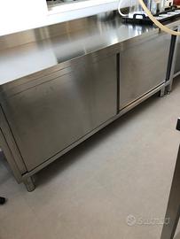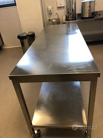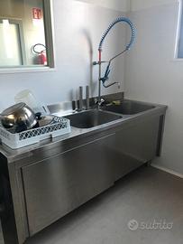 CHI APRE UN LOCALE ? ho tutto quello che ti serve. Tavoli di acciaio di diverse misure, con ruote o senza, con alzatina o senza (7 pezzi). Tavolo armadiato, o armadio in acciaio. Lavello armadiato con due vasche e sgocciolatoio e gruppo doccia. Lavastoviglie RGD50T 50X50 TR, 400 volt con supporto gambe inox. Pattumiera inox con pedale. Due lavamani con vasca tonda e pulsante a ginocchio. Armadio spogliatoio, pulito /sporco con tetto inclinato antipolvere. Tutto usato ma in perfette condizioni. Visibili e ritirabili a Deruta (PG). Allego alcune foto ma posso fornire dettagli e misure a chi è realmente interessato. Non spedisco.