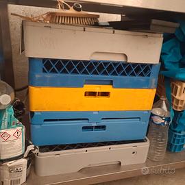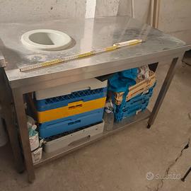 cappa aspirante inox 6 filtri 3+2 . In foto pezzo unico da 2.7 MT scomponibile se necessario 3+2 filtri Dimensioni , altezza 2.7 MT profondità 1.23 MT profondità 123 cm altezza 123cm Foro estrazione aria 35 cm Cappa senza turbina e senza condotte di estrazione prezzo 250 € Tavolo plonge con foro Dimensioni L123 cm P70 H88 prezzo 200€ Cestelli lavapiatti professionale 50x50 4 cestelli misti , posate piatti bicchieri prezzo 50 € 4 cestelli
