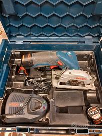 Sega circolare professionale Bosch GKS10.8 V-Li diametro lama 85 mm profondità di taglio: 90° 26.5mm - 45° 17 mm, a batteria 10.8 V in valigetta corredata da n. 3 batterie 2/Ah compreso carica batterie. Stato di conservazione nuovo: Prezzo € 180.