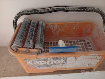 Vendo per inutilizzo materiale vario. Vaschetta per stuccare pavimenti con paletta in gomma (?25), trapano demolitore Makita (?60) macchina taglia mattonelle (25).