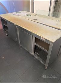 Vendo n.2 banchi da lavoro professionali in acciaio inox, ideali per ristorazione, bar, gastronomie o laboratori alimentari. Dimensioni per banco: Lunghezza: 210 cm Profondità: 70 cm Altezza: 81 cm Caratteristiche: Struttura molto robusta Ante scorrevoli con ampio spazio contenitivo Piano di lavoro ampio (presenta normali segni d'uso) Vendita in blocco. Ritiro in loco