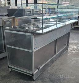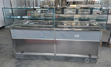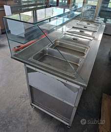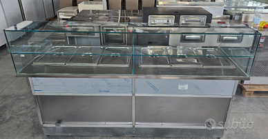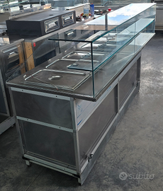 VETRINA ESPOSITIVA/BANCO CALDO/RISCALDATO A BAGNO MARIA (da arredamento locale) completo di contenitori GASTRONORM inox, illuminazione interna, vetro piatto e montanti per applicazione pannello frontale.