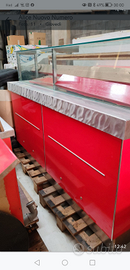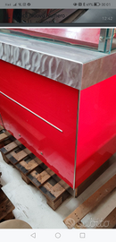 Un banco bar moderno, il ffronte con 4 scompartimenti aperti misura 198×81×95 e un banco retro con lavello tondo 235×69×85.