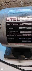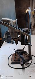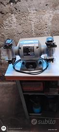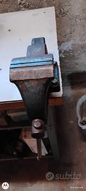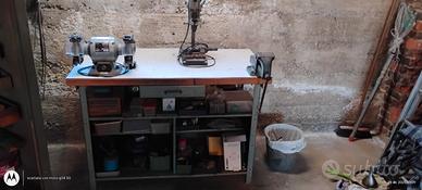 Banco di lavoro metallici dimensioni : cm. lung. 120 - larg.62 - alt. 80 con cassetto e ripiani sotto banco corredato di : morsa in ghisa con apertura fino a cm 12---- colonna di fissaggio trapano ---- trapano a mano fissato alla colonna---- coppia mole a smeriglio con motore elettrico