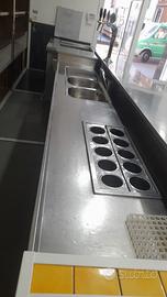 Bancone bar come in foto completamente in acciaio inox con rifiniture in legno. Completa il tutto una vetrina posteriore a scaffale in acciaio con ripiani in cristallo. Lunghezza del bancone circa 6 m, prezzo 2500 euro trattabili. Per informazioni - Anna cell. 3342573698