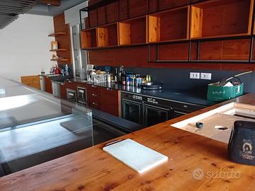 Bancone bar di lunghezza 5,50m, completo di frigo a 4 porte, 2 vetrine refrigerate, e piano di appoggio; predisposizione per spinatrice; portabicchieri in linea sul bancone.