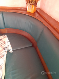 Giropanca ad angolo di circa 6 mt con cuscini in ecopelle, 6 tavoli e 14 sedie massicce.