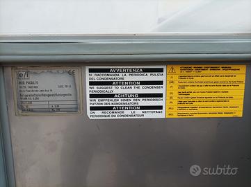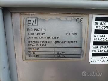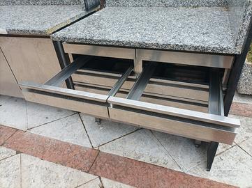 Bancone frigorifero con sovrastruttura refrigerata. Vetrina in cristallo stratificato UNI7172. Modulo 12 cassetti. Piano in marmo rosa con alzatine. Lunghezza cm. 2500+ 1000 cm. Usato 5 anni fino alla chiusura attività di pizzeria