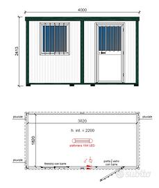 Monoblocco da cantiere, prefabbricato coibentato, misure 4x2mt. Finestre in alluminio. Impianto elettrico. Anno 2023, usato in un solo cantiere. Prezzo iva esclusa, trattabile