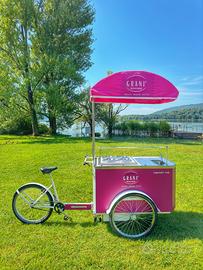 Metto in vendita pacchetto completo di 3 cargo bike da lavoro, ideali per street food, catering, eventi privati, matrimoni, feste, mercatini, festival, fiere e sample aziendali / esposizione prodotti grazie alla grande personalizzazione e alla forte presenza scenica. 1) Cargo bike GELATO (acquisto maggio 2024) 4 pozzetti da 5 kg + 4 riserve da 2,5 kg (capacità ottima per servizio continuativo in evento). Fattura dimostrabile (acquistata a maggio 2024). Piano in acciaio inox (superficie professionale e facile da pulire). Luci LED regolabili con diversi colori (perfette per eventi serali e personalizzazione brand). nclusi ricambi: 1 ruota + 2 pali di sostegno del tetto. 2) Cargo bike "BAKERY/CANNOLI" (n.2 unità) Entrambe le altre due cargo bike sono attrezzate con: Vetrina espositiva per prodotto (ideale per cannoli, ciambelle, pastry, ecc.). Ampio spazio frigo +4°C (per ricotte/creme, topping, bevande, ingredienti). Lavandino lava-mani (utile per servizio e gestione operativa durante eventi). Piano in acciaio inox. Luci LED (luce calda) per valorizzare i prodotti in vetrina. Utilizzi possibili (molto versatili) Street food & festival: postazioni pronte, impatto visivo alto, servizio rapido. Eventi privati (matrimoni, compleanni, pool party, inaugurazioni): perfette come "corner dessert/gelato" o "cannoli live". Corporate & brand activation: sampling, lancio prodotto, degustazioni, stand mobile per centri commerciali o showroom. Esposizione prodotti: vetrina + luci + frigo rendono facile presentare e conservare pasticceria/ingredienti. Condizioni di vendita Vendita solo in blocco: 3 mezzi insieme (non separo).