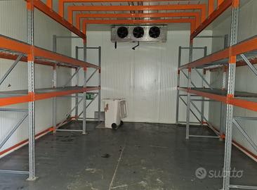 Vendo Cella Frigo positiva 6 metri x 8 metri altezza 4 metri; Completa di Scaffali; Spessore pannelli 10 cm; Motore BITZER da Hp 10 con Gas R404A; Completo di quadro elettrico Trifase; Porta da 1,5 metri per entrare con i bins o euro pallets completa di tenda frangi freddo;