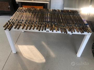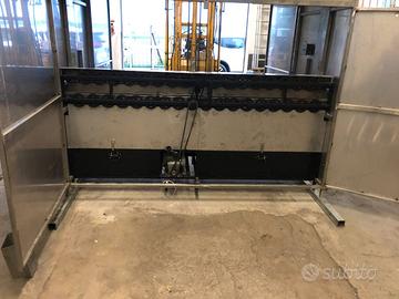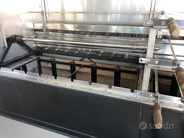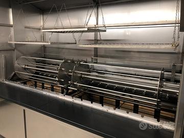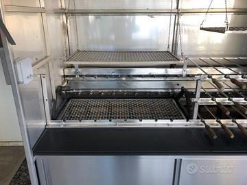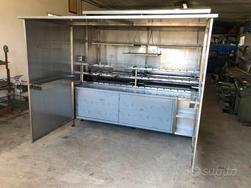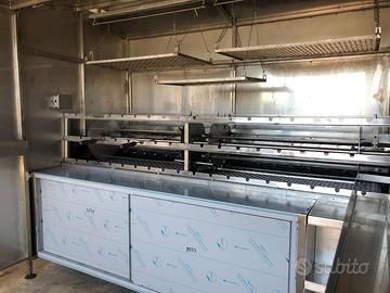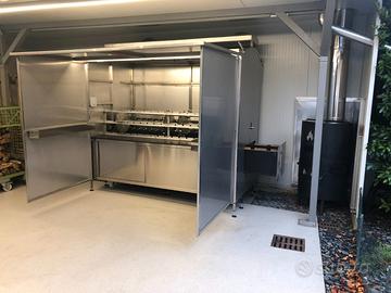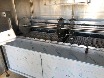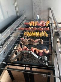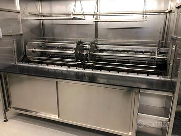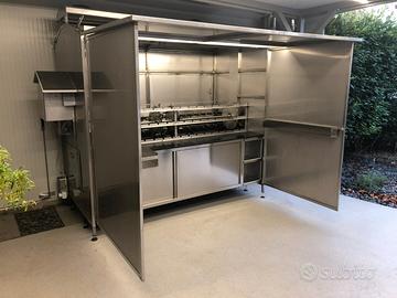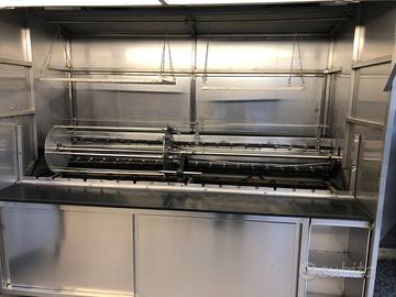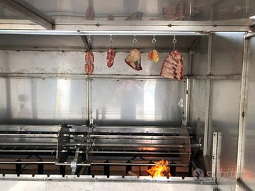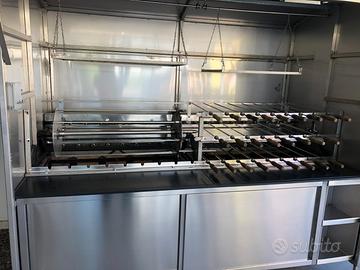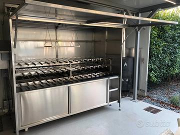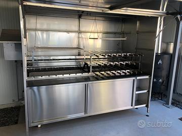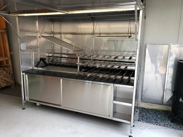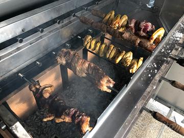 Cod. ATRIS459 Churrasco - spiedo - barbecue in acciaio inox artigianale Funzionante come nuovo Usato pochissimo Completamente in acciaio inox Meccanismo del churrasco originale brasiliano Molto versatile in quanto un unico barbecue può essere utilizzato per molti tipi di cottura tra cui spiedo, barbecue, asado, churrasco, porchette, affumicature e possono abbinarsi più cotture diverse insieme Funzionamento a legna con possibilità di modifica a gas Compreso nel prezzo viene fornito anche il bidone per le braci che si vede in foto. Il caricamento delle braci avviene tramite due cassetti scorrevoli. Con due motori 220 V indipendenti, uno per il churrasco e uno per lo spiedo Con 2 spiede indipendenti 52 postazioni per spade Le spade hanno lunghezza da 820 mm e lavorano 550 mm. In totale ci sono 120 spade 3 griglie per la cottura Capacità di cottura per 300 persone circa Con ruote per lo spostamento Con ganci per il carico con gru Con pensile ad ante scorrevoli per riporre l'attrezzatura o altro Richiudibile In caso di pioggia c'è il tetto da 1200 x 2400 mm e le pareti porta utensili e portaspezie riparano da aria e vento Dimensioni: Larghezza tutto chiuso: 1200 mm Lunghezza esterna: 2400 mm Altezza: 2400 mm Larghezza con spiovere del tetto: 1400 mm Lunghezza interna lavoro: 2340 mm Lunghezza esterna con casetta per motore: 2720 mm Base in PE alimentare colore nero: 320 x 2400 mm da utilizzare come tagliere Lunghezza tetto copertura aperto: 1200 mm