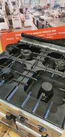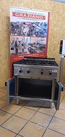 CUCINA PROFESSIONALE A GAS IN ACCIAIO INOX SERIE 90 su mobile armadiato sportellato, bruciatori medio/grandi, vasche smontabili per la pulizia, piani in ghisa, FIAMMA PILOTA, accensione manuale.