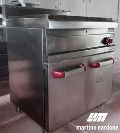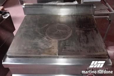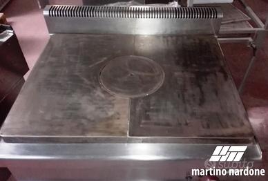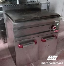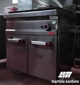 Tutto piastra gas su base armadiata dim.80x70x85H. Ideale per ricreare sapori e sistemi di cottura tradizionali. La distribuzione omogenea del calore consente infatti di realizzare al meglio salse e cotture lente che richiedono una temperatura costante. L'ampia superficie perfettamente liscia consente una grande libertà di utilizzo sia con pentole di forme non convenzionali, anche molto grandi, sia come piano di mantenimento accanto ai fuochi. Il rivestimento interno, costituito da materiale refrattario ad alto isolamento, permette la concentrazione massima del calore nella parte centrale della piastra e garantisce grande comfort allo Chef.