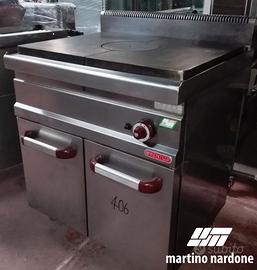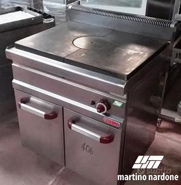 Tutto piastra gas su base armadiata dim.80x70x85H. Ideale per ricreare sapori e sistemi di cottura tradizionali. La distribuzione omogenea del calore consente infatti di realizzare al meglio salse e cotture lente che richiedono una temperatura costante. L'ampia superficie perfettamente liscia consente una grande libertà di utilizzo sia con pentole di forme non convenzionali, anche molto grandi, sia come piano di mantenimento accanto ai fuochi. Il rivestimento interno, costituito da materiale refrattario ad alto isolamento, permette la concentrazione massima del calore nella parte centrale della piastra e garantisce grande comfort allo Chef.