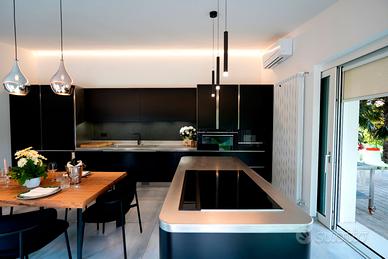 Le nostre cucine sono realizzate su progetto in monoblocco con piano unico di elevato spessore senza fughe con elementi di cottura incassati a filo piano per rendere le operazioni di pulizia più semplici e veloci.