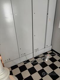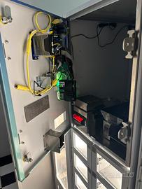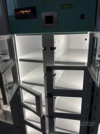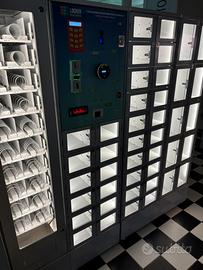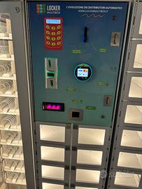 Distributore automatico Locker Multibox configurato per pagamenti in contanti e con carte di credito, può anche contenere alimenti, non refrigerato, un modulo con spirali e tre moduli con scomparti di diverse dimensioni.