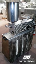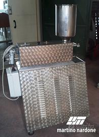 Macchina costruita interamente in acciaio Inox 18/8 ed alluminio anodizzato corredata da: 1 forcella automatica per dosatura a impulso, 1 bacinella di carico da It. 18 a completa di tappo per la pulizia, 1 pistola a impulso elettronico comandabile a piacere corredata di una serie di beccucci per dosare nelle teglie bignè, oppure per riempire a dosatura costante cannoli, krapfen, bignè e simili (dosatura da grammi 3 a 60) - 1 valvola di ritegno - 1 riduttore di pressione completo di manometro - 1 oliatore automatico per la lubrificazione della macchina - 1 dispositivo per variare a piacere la velocità di lavoro - 1 dispositivo elettronico regolabile secondo la lunghezza del dolce da applicare direttamente alla macchina. Per passare alla lavorazione di un tipo di crema ad un altro occorre acquistare delle bacinelle in più a seconda del numero delle creme da lavorare; la pulizia della macchina è automatica cambiando tipo di crema. A lavorazione ultimata si dovrà provvedere al lavaggio semplicemente con acqua calda. Produzione: 500÷4000 battute/ora.