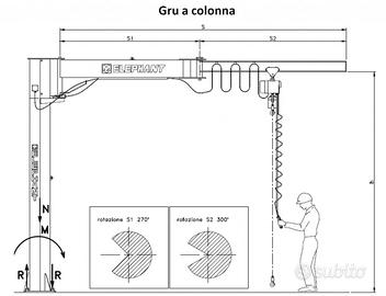 Gru a colonna marca ELEPHANT mod. CS-500/7 anno 2017 con braccio snodato S1 3 metri S2 4 metri. Altezza 4 metri. Piastra ancoraggio a pavimento 1000x1000mm. Freno pneumatico sul primo braccio. Completo di paranco RWM 500 Kg 2 VS=1/4 lunghezza catena 3,5 metri. Perfettamente funzionante. Vendita causa inutilizzo. Si vende smontata colonna principale+braccio+paranco. Documenti e marcatura CE disponibili. Soggetta a revisione da parte di ente terzo annualmente. Trasporto a carico dell'acquirente.