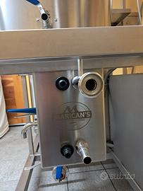 --> caldaia di ammostamento, caldaia di sparge, caldaia di bollitura, filtro, mescolatore, scambiatore di calore a piastre inox, elettropompa inox per travaso, whirlpool con elettropompa inox.