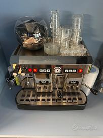 Macchina solida, in acciaio inox, a due gruppi erogatori, completa di lancia vapore e acqua calda.