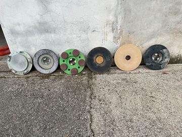 2 macchine levigatrici per finitura parquet con velocita diverse per ogni esigenza , corredate di supporti per dischi reti e spugne abrasive di varie grane , 2 supporti per levigare caldane in cemento.
