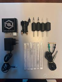 Macchinetta per tatuaggi SLIDER completa, alimentatore, clipcord, tubi ed aghi sigillati. Due tubi sono stati usati SOLO ED ESCLUSIVAMENTE su pelle SINTETICA, sono stati puliti con alcool ma purtroppo l'inchiostro dentro è rimasto. Tempo utilizzo totale 1h.