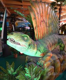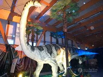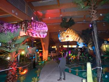 Oggetto di vendita è tutto l'occorrente per realizzare un Parco Dinosauri pronto all'uso, chiavi in mano all'aperto oppure indoor. La maggior parte dei dinosauri sono animatronici; sono tutti riprodotti fedelmente in base ai fossili e a grandezza naturale, per esempio, il T- rex è lungo 12 metri e alto 4,5 mentre l'Apatosauro 16 m ed alto 7,5. I dinosauri (come la vegetazione artificiale ed il resto delle scenografie) sono di elevata qualità nonché validati scientificamente e non richiedono alcuna installazione. Nello specifico: - 18 dinosauri animatronici/statici - 2 dinosauri-costume - 3 dinosauri "interattivi", cavalcabili. - 3 uova giganti per foto delle quali una con un piccolo di T - rex - Portale d'ingresso al Parco lungo 11 metri e h 3,5 con riproduzione di un fossile di T - rex - 400 piante piccole - 70 piante medie - grandi tra le quali 10 palme alte dai 4 a i 6 metri - 18 espositori con descrizione dinosauri - Qualche centinaio di metri quadri di panno verde - Sfondi/scenografie: circa 30 teli in pvc di varie misure (3 - 4 m di altezza) in grado di rivestire un'area di 2.000 mq) in stile "realistico-cartoon" - Impianto stereo con sottofondo di foresta, temporali - Circa 300 metri di cavi elettrici di cui metà impermeabilizzati - Circe 300 metri di corda per delimitare il percorso - 2 macchine fumo - Scaffali di varie misure, 3 vetrinette ed altri espositori per realizzare un Book-shop di circa 100 mq - Merce book shop (gadget vari, giochi-laboratorio, etc...) - Banco + scrivania e sedie per biglietteria - Tavolini con relative sedie per bambini - 5 estintori + 1 per quadro elettrico - Misuratore fiscale tematico