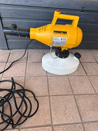 L'oggetto nell'immagine è un nebulizzatore professionale Master SF 3, progettato per la sanificazione e l'igienizzazione ambientale. Potenza: 1.400 W. Capacità serbatoio: 4,5 litri. Gittata: Raggiunge una distanza di spruzzatura tra 8 e 10 metri. Volume di spruzzatura: Regolabile da 150 a 260 ml/min, con particelle di dimensioni tra 10 e 150 micron.