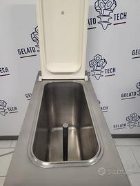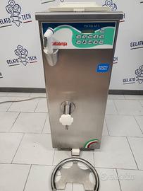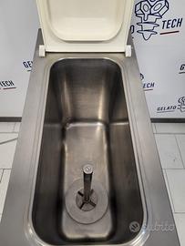 Questa macchina per gelato lavora con uso del glicole, questo permette che il riscaldamento e il raffreddamento non avvenga direttamente tramite resistenze che agiscono sulla vasca, ma tramite un liquido, il glicole, che cede temperatura alla vasca che contiene il gelato, questo evita che la base in lavorazione subisca shock di temperatura.