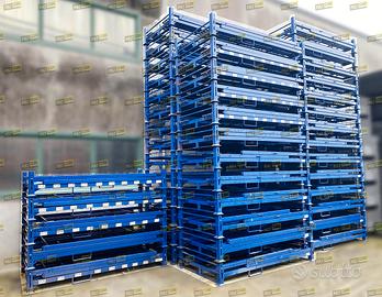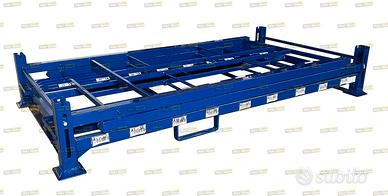 Contenitori rack o scaffali mobili usati, marca Arcom modello AR05MIX, ripiegabili per lo stoccaggio verticale degli pneumatici per auto e SUV con misure da 480 a 790 mm: impilabili fino a 4 livelli per ottimizzare al massimo lo spazio nel magazzino; dotati di barre in acciaio posizionabili liberamente sulle fiancate per adattare lo stoccaggio delle diverse misure. Misure: mm 2383 X 1250 H2200 chiusi mm 375. Lotto di OTTIMA QUALITA': possibili e limitatissimi segni di ruggine superficiale, il tutto come da documentazione fotografica.