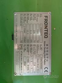 Vendo piattaforma elevatrice a pantografo FRONTEQ, in ottime condizioni, ideale per lavori in altezza in sicurezza: magazzini, montaggi, manutenzioni, edilizia leggera, impianti elettrici ecc.
