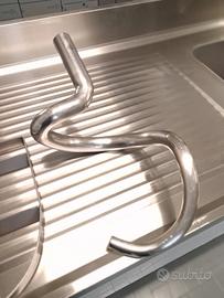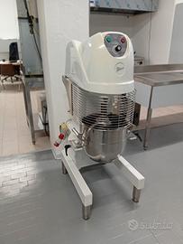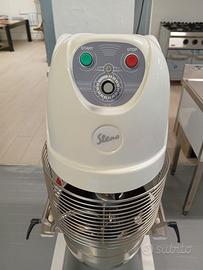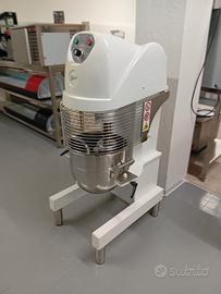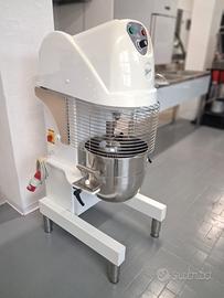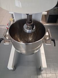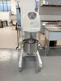 Planetaria mod. PL30 F/V da 30 lt Struttura robusta in lamiera d'acciaio di colore bianco, coperchio e profili in termoformato grigio, velocità variabile dell'utensile con ampia gamma di regolazione, gli utensili possono essere facilmente montati e smontati senza dover rimuovere la vasca dalla posizione di lavoro, trasmissione ad ingranaggi montati su cuscinetti a sfere che non richiedono manutenzione e rendono la macchina stabile,silenziosa e duratura, Protezione di sicurezza in griglia in acciaio inox, alimentazione a 400 V trifase, macchina costruita secondo le norme CE.