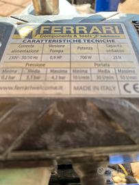 Modello FERRARI simplywash Pompa per il lavaggio, il riempimento e la disaerazione degli impianti a circuito chiuso (solare, riscaldamento e raffrescamento) con interruttore on/off. Adatta per il riempimento dei pannelli solari. Caratteristiche : Elettropompa autoadescante 220V - 700 W - 0,9 HP - 4,2 Bar - 50 lit/min. serbatoio da 25 lt. Dimensioni: P 45 x H 83 x L 48 cm Peso: 17 kg Dotazione: 2 tubi retinati Ø 25 da 3 m raccordati da 3/4? Macchina usata, come nuova. Utilizzata solo su 5 cantieri. Possibilità di fatturare