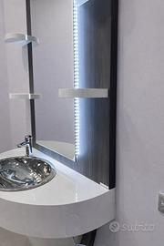 Lo specchio retroilluminato a LED garantisce ottima visibilità e un forte impatto estetico, mentre il lavandino integrato rende la postazione pratica e funzionale.