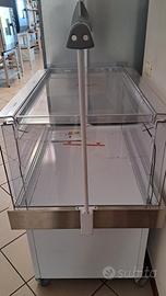Pozzetto refrigerato espositivo con vasca completamente trasparente, su ruote con struttura e cartello pubblicitario superiore a mezzaluna, da personalizzare, illuminazione a led. Mai consegnato e mai acceso dopo il collaudo