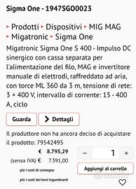 Vendesi SALDATRICE MIG/MAG MIGATRONIC SIGMA ONE 400, impulso sinergico raffreddata a liquido, tensione di rete 3×400volt. Macchina in condizioni di pari nuovo, disponibile a prova e visione previo appuntamento telefonico (Machinery Market)