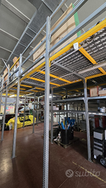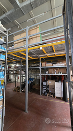 Scaffalatura a soppalco usata, completa di parapetti e scala per salire al primo piano. Mis. mt 14x mt. 5 h3 mt . Altezza complessiva con parapetti al primo piano h.4 mt.