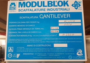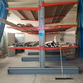 Vendesi per cessata attività scaffalatura industriale Cantilever Modulblock , acquistata nuova e installata all'interno del capannone. Praticamente pari al nuovo. La scaffalatura è stata accessoriata con telai metallici di congiunzione dei bracci oltre che di pannelli in mdf da 2cm onde consentire lo stoccaggio anche di pallet , pacchi , minuterie , ecc.