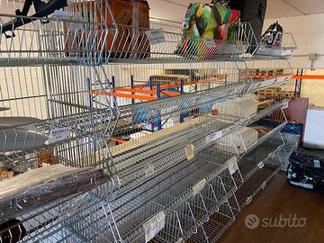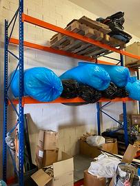 Scaffalature professionali da stoccaggio pallets, portata oltre 1000 kg al mq. Disponibili 17 fiancate (azzurre) da H3,50 m x L1 m, e 38 traverse ripiani (arancioni) da L2,70 m x P1 m. Disponibili anche ceste in filo di acciaio per stoccaggio al dettaglio - ultima foto.