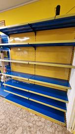 Scaffalature in metallo da 12 piantoni h240 cm,l 100 cm l'uno,con un totale di 80 ripiani da 40 cm di profondità e 16 primi ripiani da 45 cm. Una gondola doppia h150 cm, l.200 cm,con 20 ripiani. 1 gondola singola h 150 cm, l 100, con 6 ripiani. 3 pannelli muro per blister h240, l 80 cm. 3 pannelli in metallo per blister con sbarra h240, l 100 cm. 50 barre e circa 700 ganci per blister. Per un totale di 22 metri lineari di esposizione. Ritiro nel comune di Cles (TN) Via Marconi 13/b