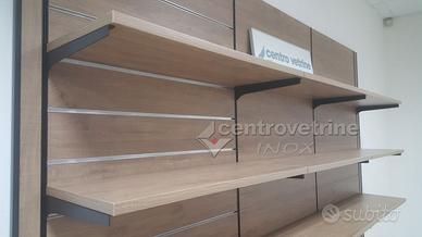 Scaffali in legno Linea 58 kit 7 da 300 ideale per negozi food e negozio non food. Scaffale con schienale in legno bifacciale liscio/dogato da fissare a parete, piani in legno regolabili in altezza con portata 40 kg. peso distribuito uniformemente, rifinito con cornice in legno e profilo di finitura il tutto composto da: