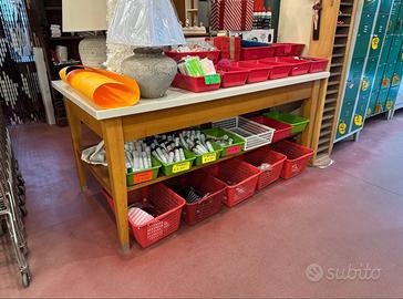 Poi ci sono 33 bancate uguali ma con profondità 40 invece che 60, ed altre 40 bancate con la stessa misura ma che sono larghe 1 metro invece che 120 cm. Poi ci sono 33 gondole larghe 1 metro ed altre 250 cm, i ripiani sono 4/5 per gondola ed hanno profondità 40 cm. Infine ci sono dei grossi tavoli, uno con il ripiano in materiale composito bianco ed un altro in legno massello, sono enormi, solidissimi e pesantissimi, di una robustezza infinita, più altre cassettiere, piccole scaffalature, espositori, carrelli spesa (N. 10 piccoli e 3 grandi), carrelli vari tipo IKEA ed altre piccole attrezzature. Calcolate servivano per scaffalare un negozio ed un magazzino di casalinghi di 800 metri quadri per farvi un'idea dell' estensione.