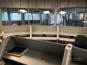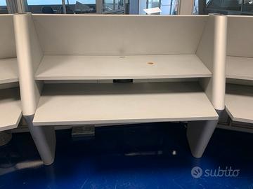 scrivanie da call center-30 postazioni totali (modulari in blocchi da 3) colore argento ideali per uffici, cooworking o sale operative. Possono essere unite in blocchi da tre postazioni formando un leggero arco o utilizzate singolarmente a seconda delle esigenze. Dimensioni circa 180cm di lunghezza, struttura robusta e stabile, con piano d'appoggio comodo per compiuter, telefono o documenti. Design professionale e uniforme.