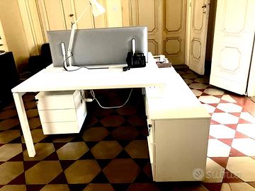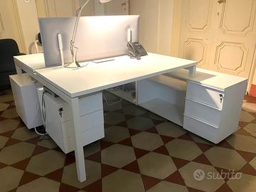 Si tratta di una postazione di lavoro composta da due scrivanie che appoggiano in parte su un mobile contenitore fornito di ripiani e di due cassettiere.