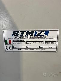 Segatrice a nastro automatica BTM Modello AT 303 TCT Anno 2022 Condizione Usato CAPACITA' DI TAGLIO 90° : Tondo 300 mm Quadro 300 mm Rettangolare 300x150 Dimensioni lama 3920x34x1,1 mm Altezza piano di lavoro 830 mm Potenza motore lama 2,2 KW Corsa carro 800 mm Velocità lama 20 : 150 mm/min Dimensioni ingombro 2050x2110x1920 mm Peso 1650 kg Documentazione: Libro di istruzioni e Cert. CE Pronta Consegna