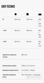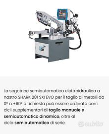 La segatrice semiautomatica elettroidraulica a nastro SHARK 281 SXI EVO per il taglio di metalli da 0° a +60° a richiesta può essere ordinata con i cicli supplementari di taglio manuale e semiautomatico dinamico, oltre al ciclo semiautomatico di serie. Disponibilità immediata per ulteriori informazioni e prezzo telefonare al numero 338-5273389.